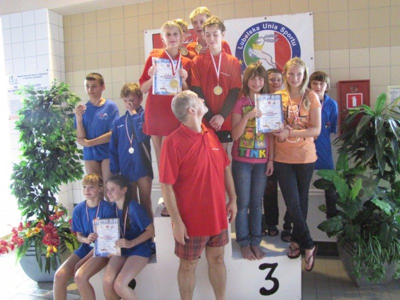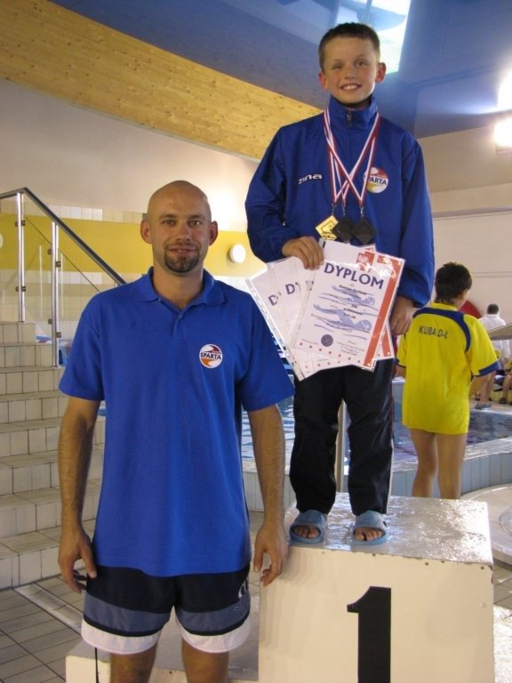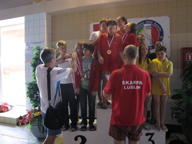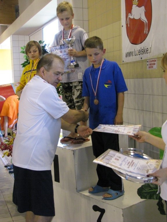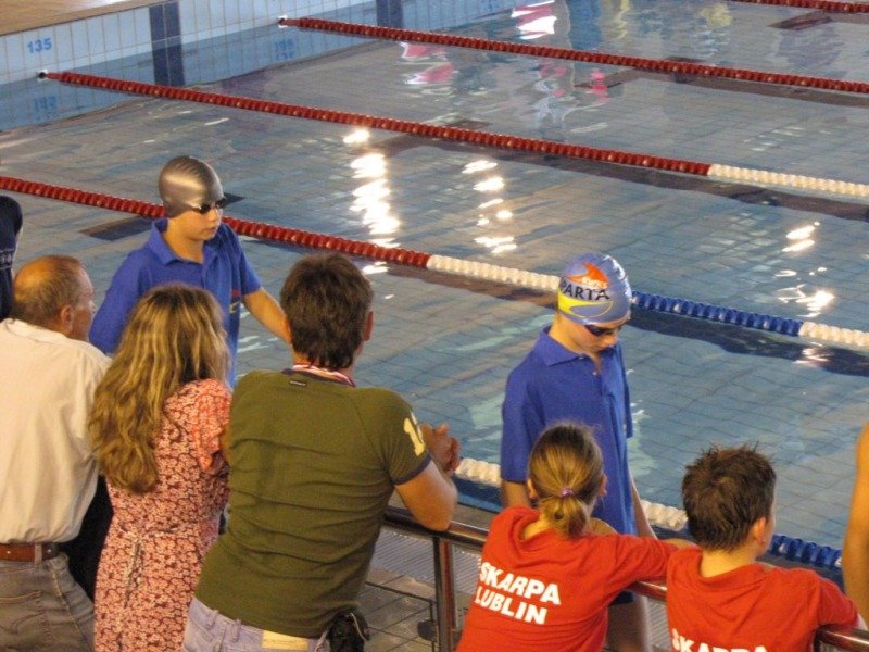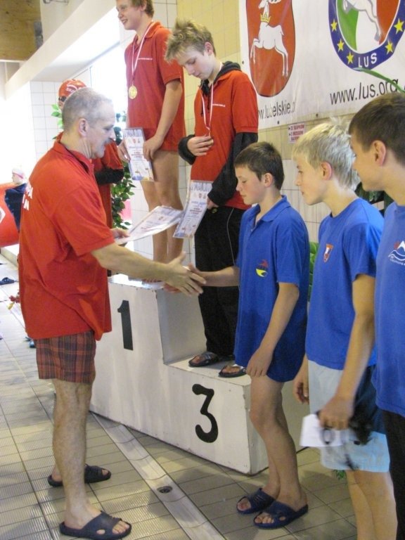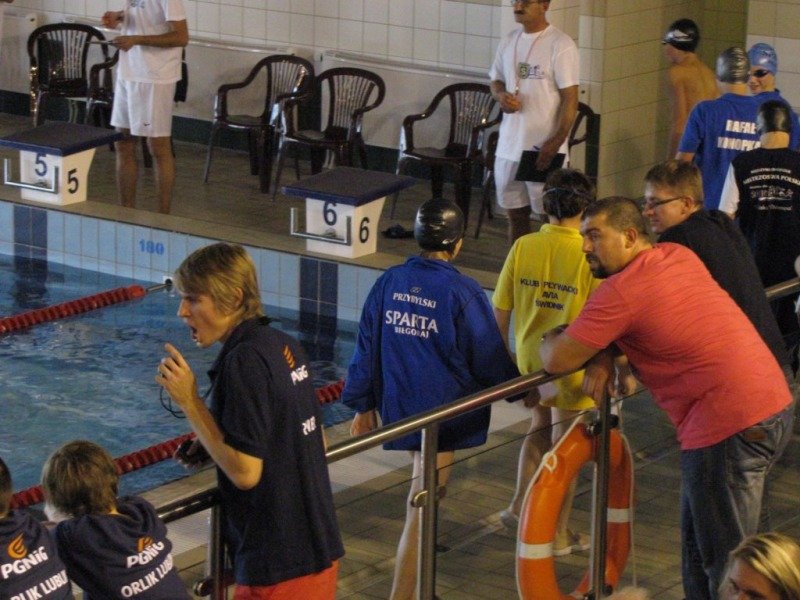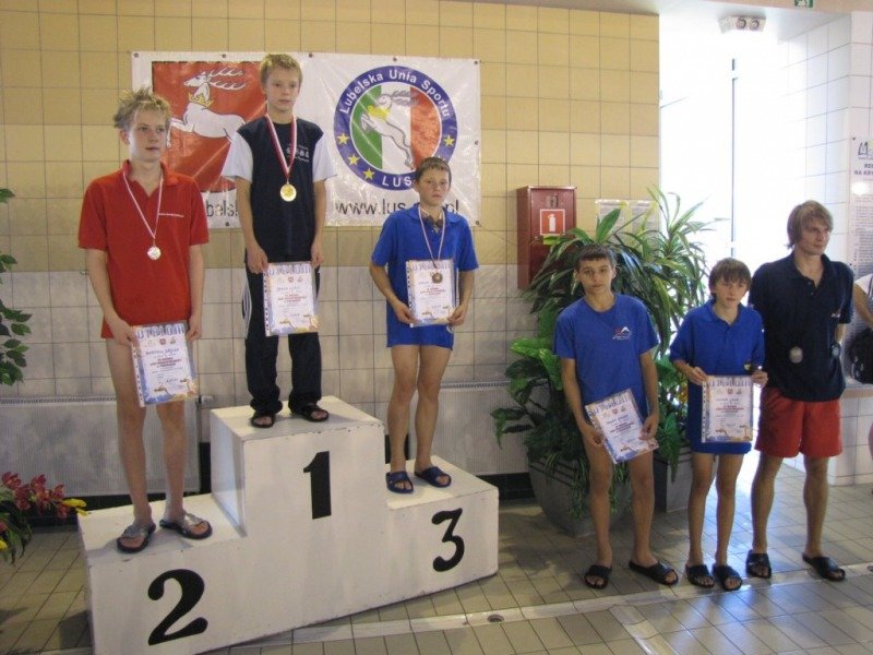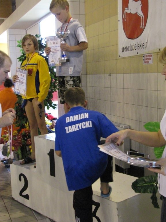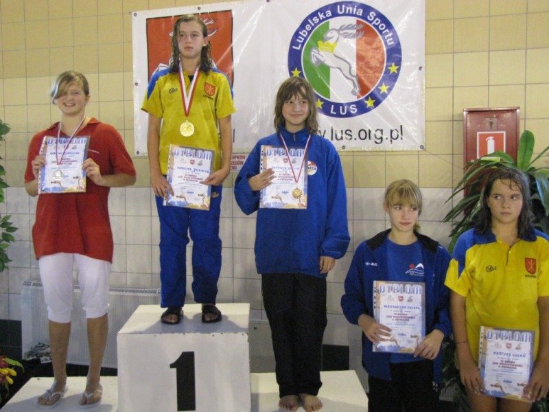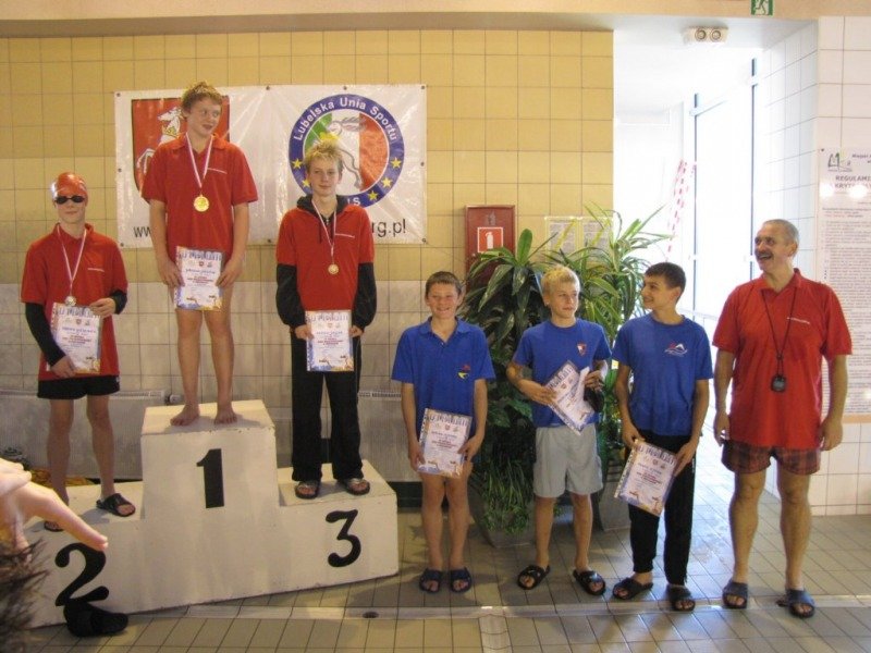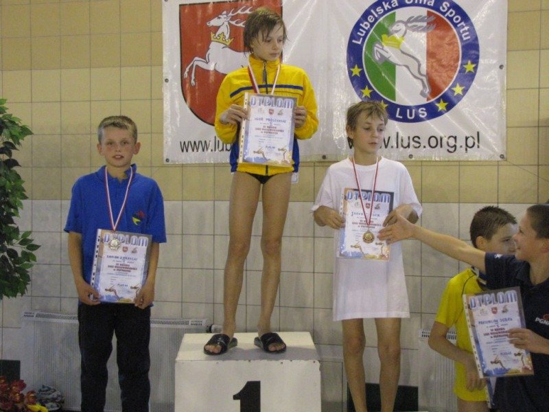 Dwukrotnie na podium stawał Damian Zarzycki. Był drugi na 100 metrów stylem grzbietowym(1:20.66) oraz trzeci na 50 motylkiem(36.93) wśród o rok starszych kolegów. Bardzo dobry czas 30.44 na 50 dowolnym Adriana Misiarza pozwolił mu zająć tylko czwarte miejsce ale za to był trzeci na 200 metrów stylem klasycznym(2:58.69). Trzecie miejsca zajęły w swoich kategoriach wiekowych dziewczęta na 100 metrów stylem grzbietowym. Patrycja Kościk osiągnęła czas 1:18.59 a Natalia Mizak 1:26.25. Po raz kolejny znakomicie wypadły nasze sztafety. Tym razem startowały sztafety mix czyli po dwóch chłopców i dwie dziewczyny. Drugie miejsce zajęła drużyna płynąca na dystansie 4x50 stylem dowolnym(2:14.81) w składzie: Jakub Przybylski, Kinga Zdziobło, Rafa Konopka i Sara Jakobik. Na trzecim miejscu podium uplasowała się sztafeta 4x50 stylem zmiennym(2:28.66), wystąpili w niej Patrycja Kościk, Kacper Sawa, Adrian Misiarz oraz Katarzyna Łubiarz. Młodsze sztafety uplasowały się odpowiednio na 4 i 5 pozycji. Starty naszych zawodniczek i zawodników rocznika 1999 i 1998 uplasowały RWKS SPARTA na 4 miejscu(3 punkty stratą do trzeciej Lublinianki) w klasyfikacji końcowej tych zawodów i umocniły na 5 w generalnej. Kolejna V runda Ligi Wojewódzkiej Dzieci i Młodzików 11 i 12 letnich w pływaniu w październiku.