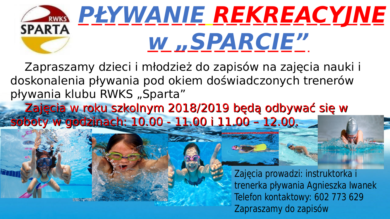 Rekreacyjne nauki i doskonalenia pływania pod okiem doświadczonych trenerów pływania klubu RWKS „Sparta”.